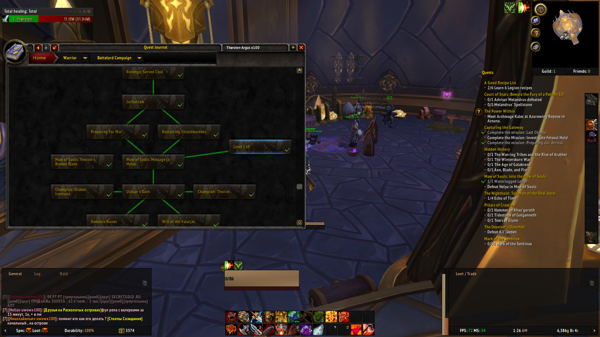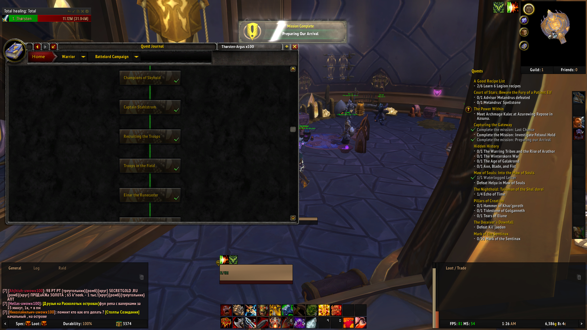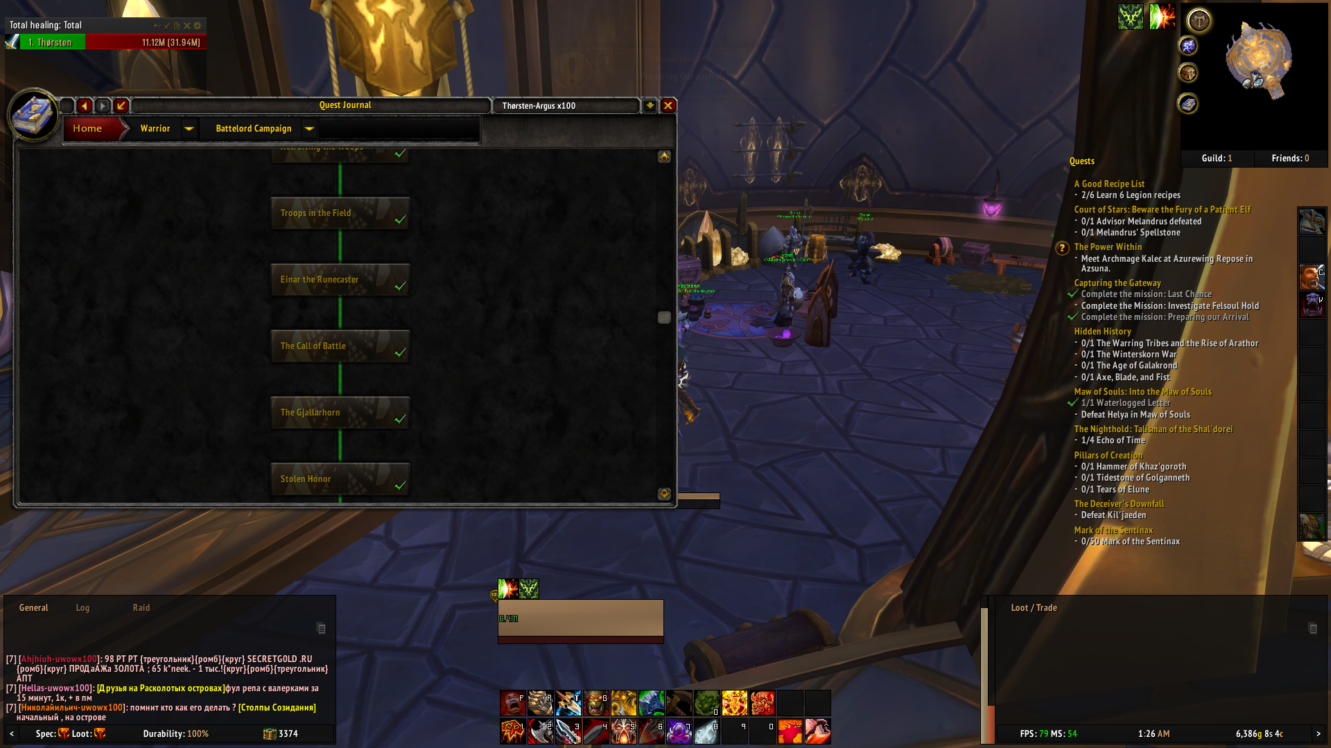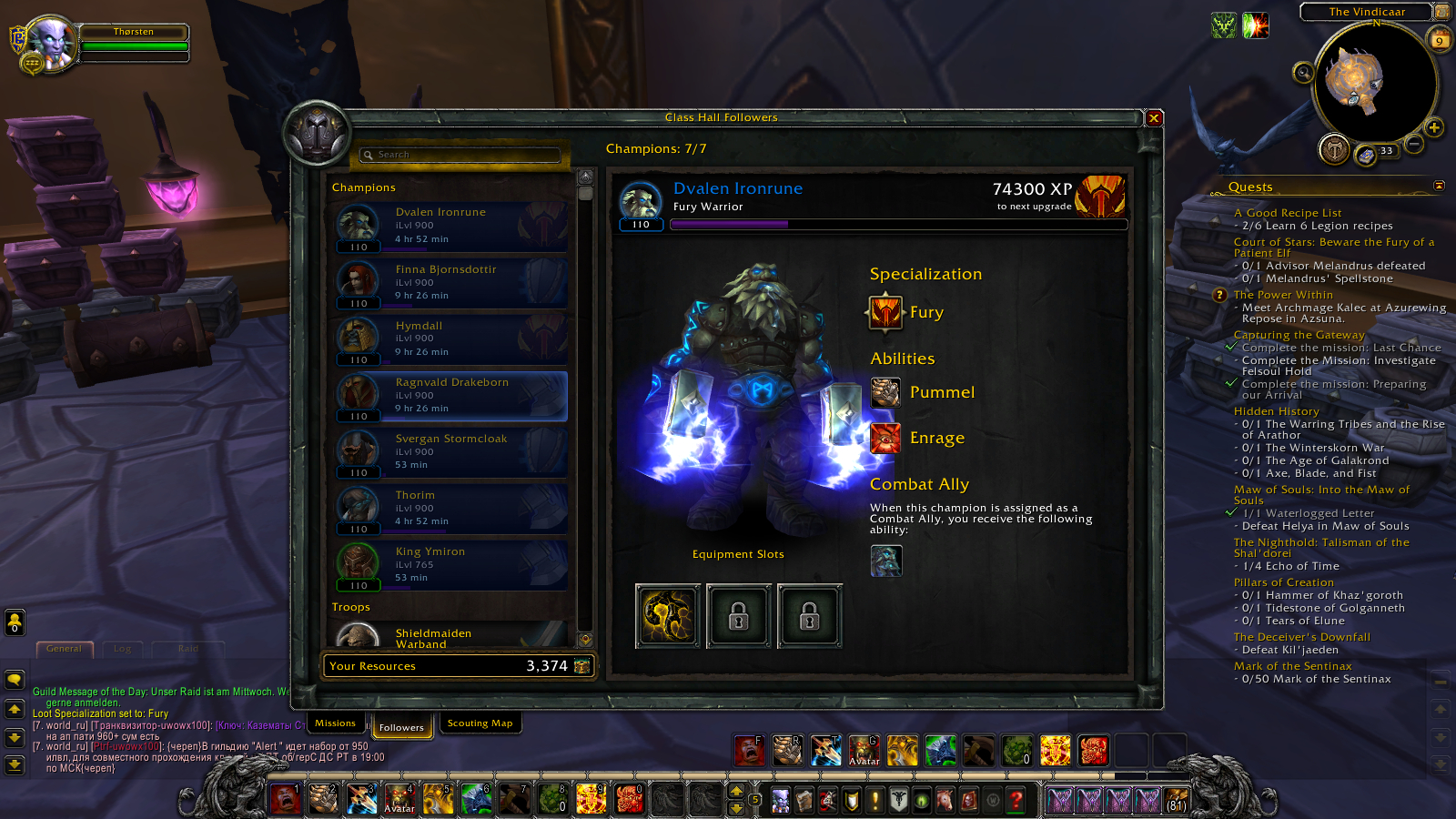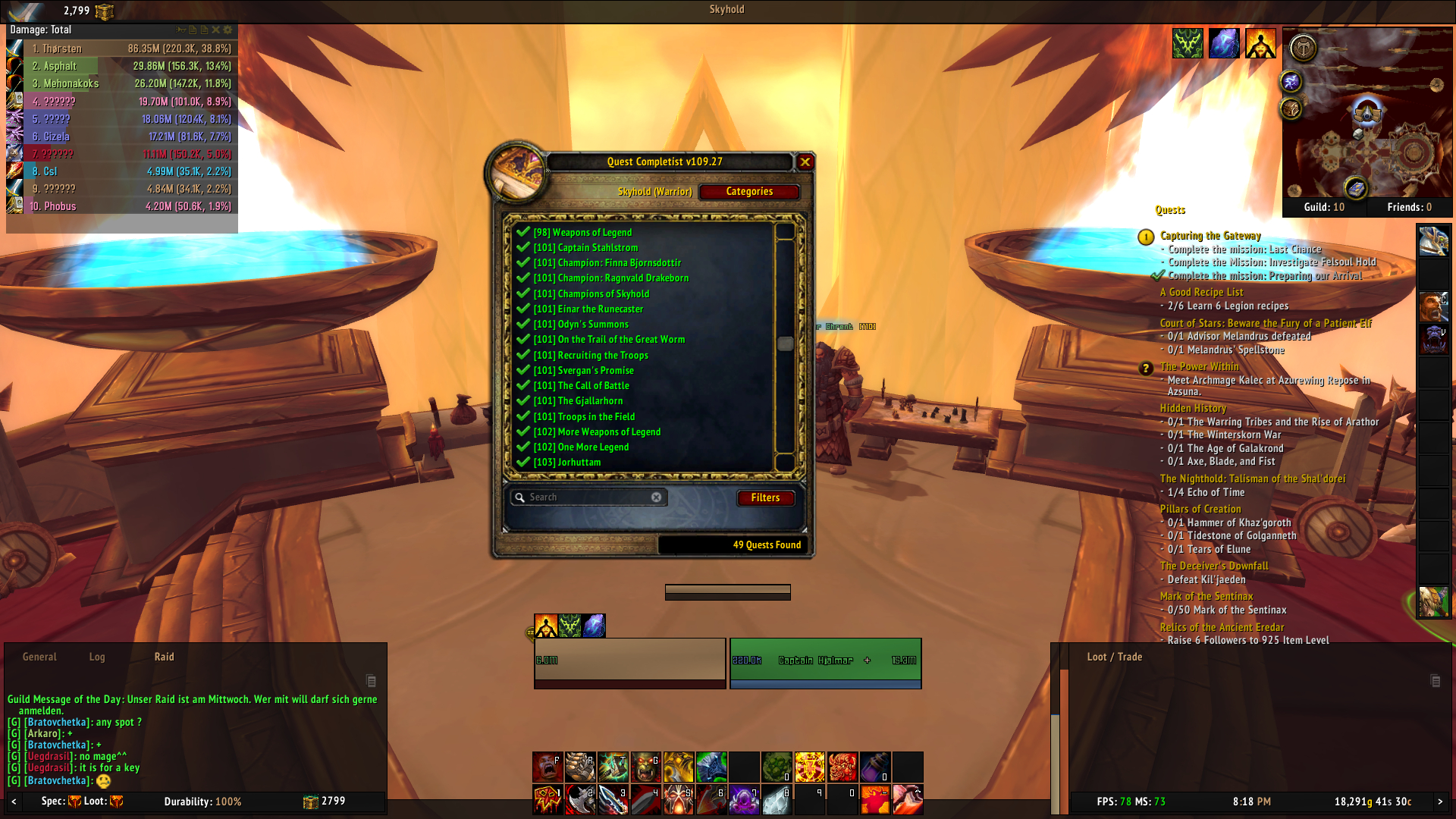 | Description | Hey , as stated by myself here: https://forum.arguswow.com/topic/1671-reopen-problem-with-quest-ofwarrior-campaign-preparing-for-war/ and somehow by someone else here: http://tracker.legionbugs.com/view.php?id=4345 (I was lost quite heavily in google translation) I have a problem with my warrior order hall. On the quest "Capturing the Gateway" (https://www.wowhead.com/quest=43577/capturing-the-gateway#storyline) I can only complete the mission "Preparing our Arrival" - over and over again. "Investigate Felsoul Hold" never appears and "Last chance" appears after "Preparing our Arrival" is completed for the first time, but when I click "Start Mission" (with Hymdall assigned to it, the screens turns back the the list without sending any champions. I restarted the quest several times and deleted the cache in between, but I always fail at the same point. I checked the quest order on WoWHead (https://www.wowhead.com/class-hall-campaign-for-the-third-artifact-relic-guide) and compared it with the add-on "Quest Completist" (and also all IDs seperately via chat). It seems all correct (see proof/screenshots). Only the last three missions missing. Any help welcome. | ||||