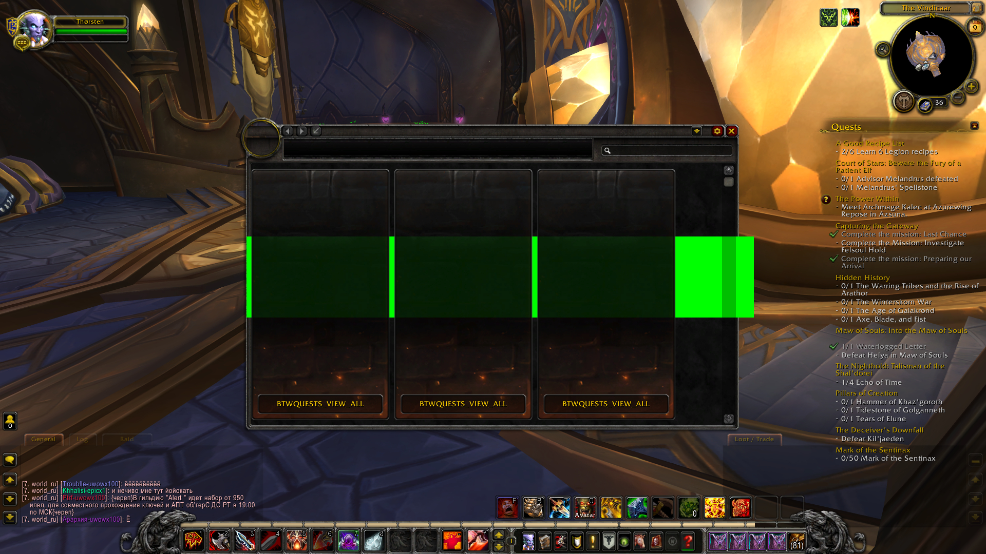 Hello. Perhaps you downloaded the addon files for version 8.x, for the addon to work normally you need to download two files from archives that have notes that they are for version 7.3.5. I don’t consider the option that you incorrectly placed the files in the addons folder or put them in an extra subfolder. Perhaps you forgot to download the add-on for the Legion add-on or unzipped it. I will provide you with direct links to both addon files that work fine. If you wish, you can find the source file location on the add-ons site. https://www.curseforge.com/wow/addons/btw-quests - version v1.1.3 from Jul 7, 2018 for 7.3.5 https://www.curseforge.com/wow/addons/btw-quests-legion version v2 from Jul 4, 2018 for 7.3.5 https://www.curseforge.com/wow/addons/btw-quests-legion/download/2579240 https://www.curseforge.com/wow/addons/btw-quests/download/2580238 This addon shows the status of stronghold quest chains of any class, storylines of locations, professions and some additional quest chains. In the add-on window, you can clearly see if the missions are missed or the order of their execution is violated, and by the name of the quest in the entry you can see the starting conditions, video of execution and comments. My comment only refers to the technical aspect of using the addon BtwQuests. I don’t know if this addon will help to solve the main problem, but by itself it greatly facilitates any quests in the game. On the topic, I can offer a check of the following points - in all topics, for some reason, when choosing champions for the mission, one of the obstacles was not closed. And the following bug scenario is possible - the basic chance of completing a mission is calculated incorrectly and if the obstacles are not parried out correctly, the calculation gives a negative chance, the mission does not start. But 100% chance is displayed. I didn’t have a complete refusal to launch the mission, but the incorrect calculation of the chance before the launch of the mission (showing 200% before launch) and after the start of the mission, the recalculated chance ranged from 27 to 47%. Not always, not at all classes and only on very random missions. |