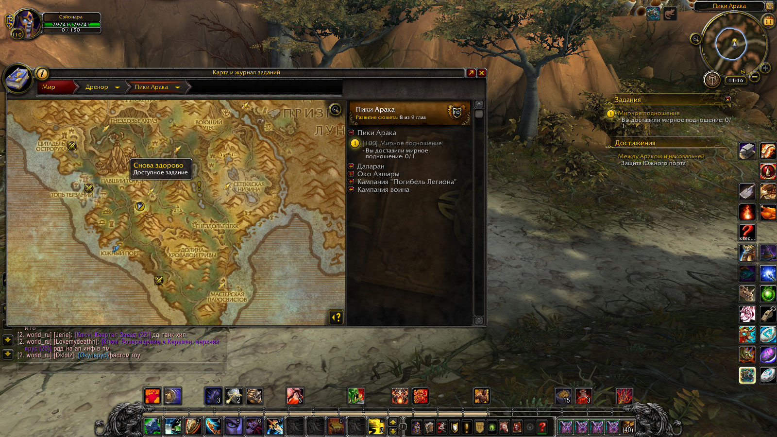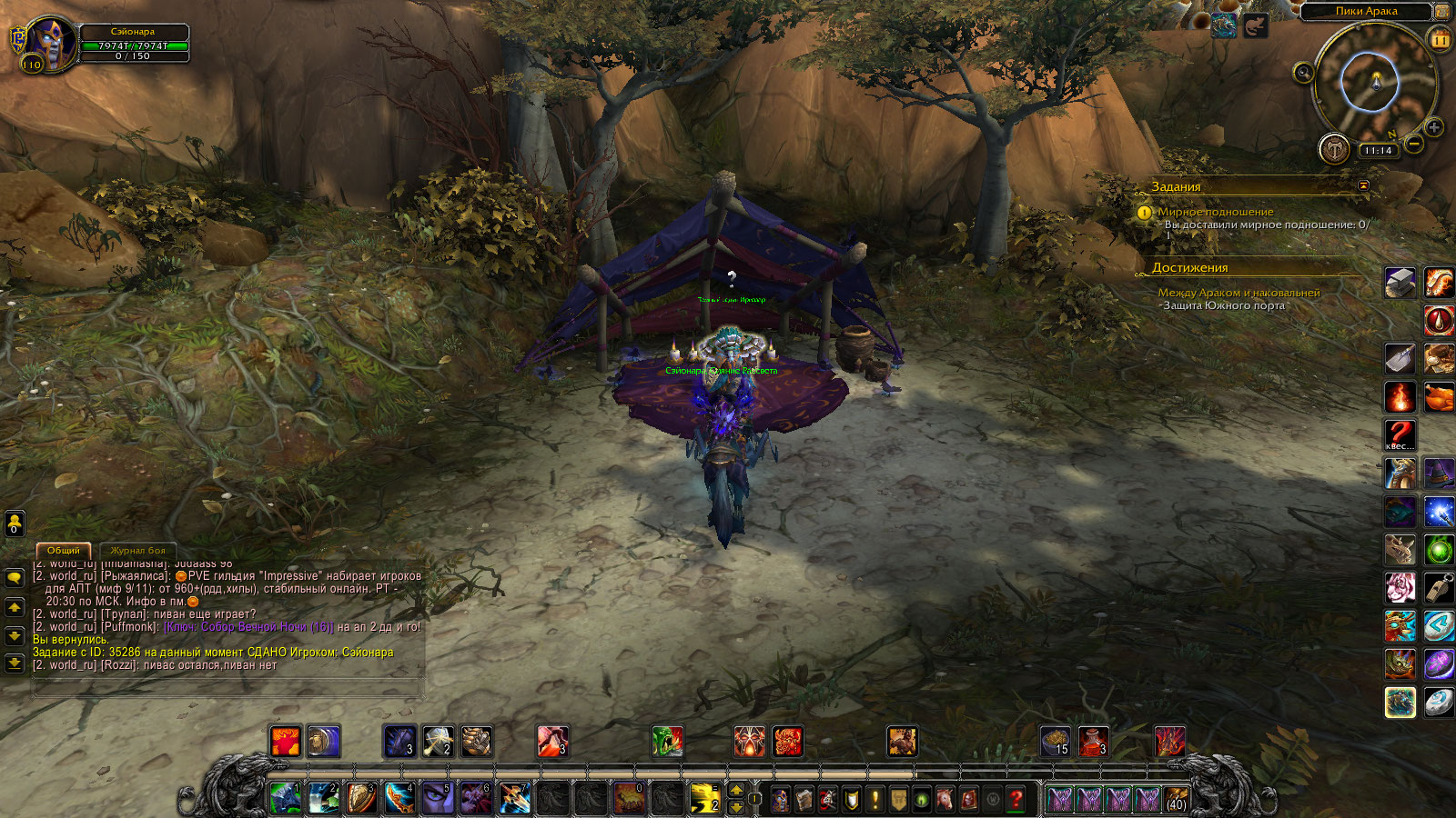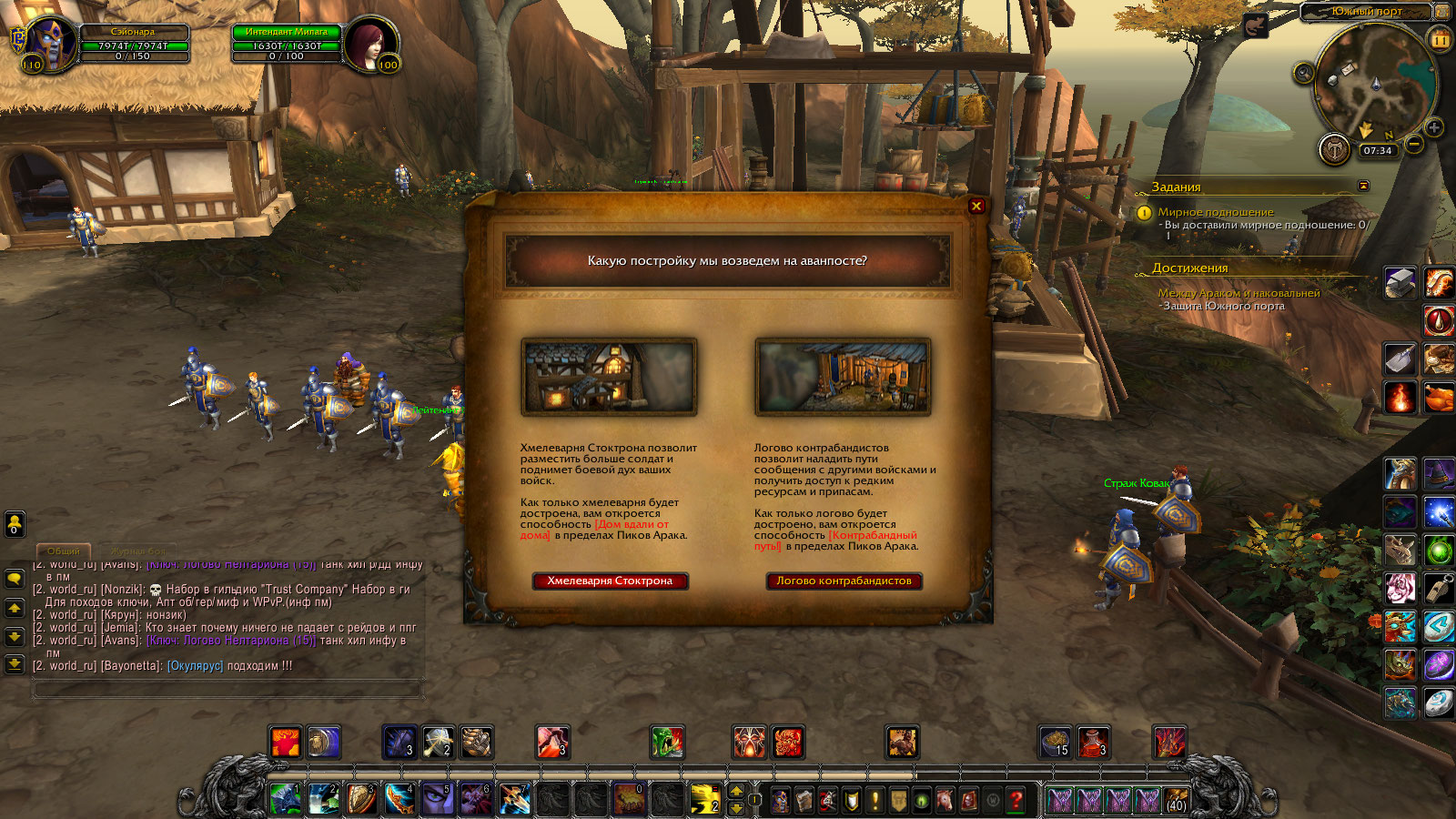 | Description | Для получения достижения -между Араком и наковальней нужно выполнить условие а именно Этап с названием -Защита Южного порта .Для выполнения которого требуеться сделать задания- Защита Южного порта 1. Своих не бросаем (35274) 2. Смотр войск (35276) 3. Какие будут приказы, командир? (35286) 4. Возвращение в Гнездовье Терокк 5. Покушение на убийство 6. Знак убийцы 7. Сила яда 8. Внешняя мотивация 9. Гардул Ядовитый Нож 10. Теперь он попался 11. Времени в обрез И вот как раз на 3 квесте случился затык-Стол выбираетьсяи можно выбрать тип постройки но нажав кнопку НИЧЕГО не происходит и сам стол уходит в ребут минуты на 2-3.И потом снова активен и можно выбирать здание(но мувика с постройкой нет и здание не строиться)а раз не построено здание то нет и продолжения цепочки потому как при постройке ХМЕЛЕВАРНИ на аванпост придет НПС-(83549)Гульда Теневой Клинок и продолжит цепочку заданий.Из комментариев узнал что нужно активировать преквестами а именно у НПС(82709)Милли Осворт-Мирное подношение(35699) и НПС(81929)лейтенант Виллем-Сдружиться с местными(37327)-Милли дает задание тащим ящик к другому НПСу и сраная птица не хочет его принимать точнее у НЕЕ просто отсутсвует завершение задания.А Лейтенант стоит столбиком и вообще больше заданий не дает. | ||||