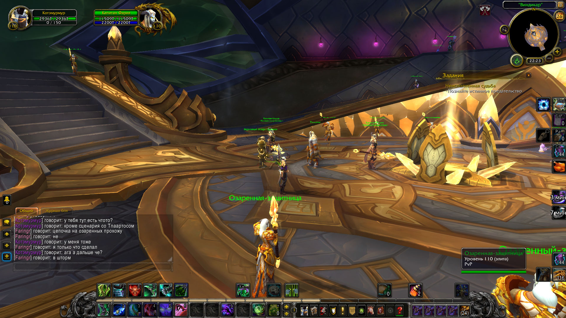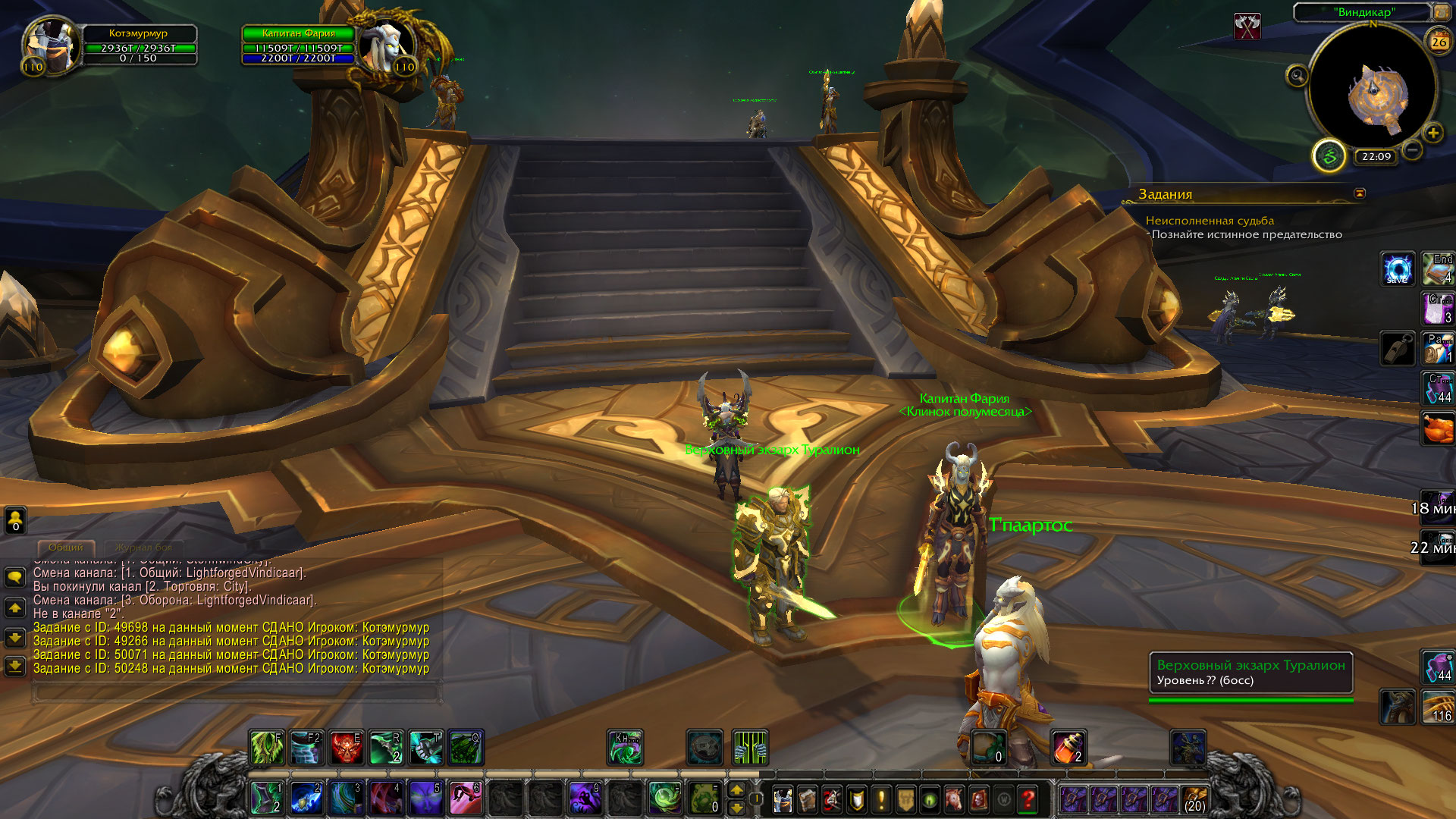| Description | прохождение кампании "Союзники Альянса: озаренные дренеи" остановилось после появления маяка Озаренных в Штормграде. мои действия: 1. Маяк посольства союзников Альянса использован 2. прохождении сценария с Т'паартосом 3. телепорт обратно на Виндикар 4. Капитан Фария поговорила с Т'паартосом далее, как я понимаю, должен был начаться квест "Кузня Вечности", но... Фария больше не разговаривает после сценария с Т'паартосом. на скрине видно, что у меня пустой Виндикар, нет доп предметов. с. больше нет рабочих итемов, кроме маяка туда-обратно и никто из НПС со мной не говорит я проходила этот квест другим персонажем ранее и все было нормально, тут же он застрял после сценария с Т'паартосом. квест на вовхеде https://ru.wowhead.com/quest=49698/%D0%BE%D0%B7%D0%B0%D1%80%D0%B5%D0%BD%D0%BD%D1%8B%D0%B5 след квест,который не начался https://ru.wowhead.com/quest=49266/%D0%BA%D1%83%D0%B7%D0%BD%D1%8F-%D0%B2%D0%B5%D1%87%D0%BD%D0%BE%D1%81%D1%82%D0%B8 первый скрин мой, второй - с видео. как видно - вверху на видео есть какой-то стол и нпс вокруг, у меня его нет | ||||