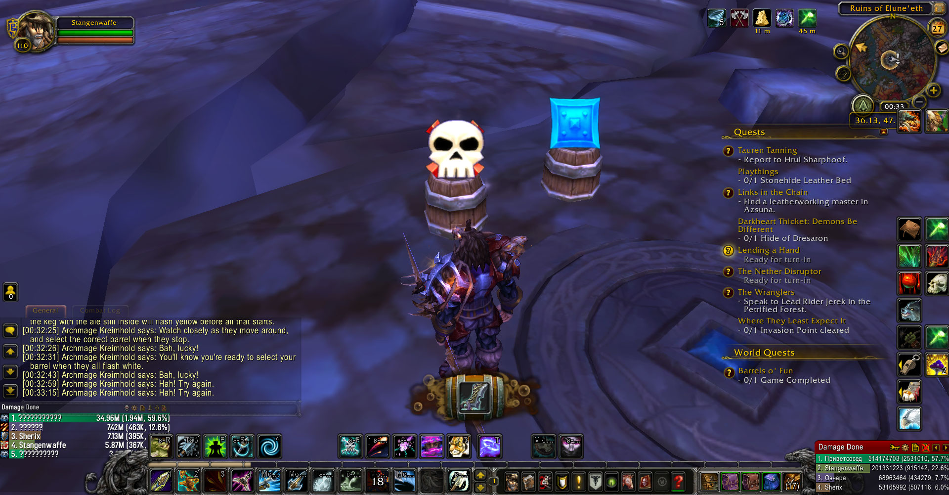 | Description | This Worldquest does not work correctly. Very often the Barrels are stacked so that you cant click on the Right one. Also when clicking the button to start sometimes no Barrel Begins to Shine so no Barrel is the Right on And another bug I had with this quest: Even after clicking the Right one 3 times in a row it will sometimes not be complete the quest | ||||