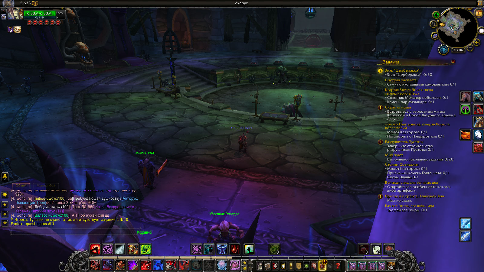 >>все артефакты были получены,после переноса сюда,хотел сделать цепочку квестов и все пропало!1 артефакт получил,больше в оплоте нет квестов Клава, я %@^#%.... >>Аддон Вами написанный не работает у меня Такое может быть, если тупо установить актуальную (для 8.1) версию аддона или не установить вторую часть, которая отвечает за квесты Легиона. Чтобы аддон работал в условиях наших серверов нужно устанавливать релиз для версии 7.3.5 А чтобы получить файлы аддона с этим релизом на странице аддона надо выбрать вкладку Files , затем нажать кнопку View all справа над таблицей версий. И отмотать несколько страниц назад, пока не найдете релиз для 7.3.5 Аналогично выполнить для второй части аддона BtWQuest: Legion А кем написан аддон - надо смотреть на странице загрузки, я не помню точно, голландцы вроде. BtwQuests собственно и нужен ( в большей степени Вам) чтобы понять до какой степени дырявые последовательности выполненных Вами квестовых цепочек как в оплоте так и в части сюжетных линий разной направленности. >> какими командами? Вы будете удивлены , но сервер понимает целый набор консольных команд, некоторые из которых специально созданы для облегчения работы тестерам и игрокам. Например команда ".quest state (quest_ID)" позволяет получить состояние квеста с указанным ИДентификатором для персонажа, который взят в таргет исполнителем команды. Сокращенная форма записи ".q s (quest_ID)" . Во всех случаях quest_ID - от одной до пяти цифр номера квеста с Wowhead. Команда как и многие другие вводится в строку чата, таргет на себя. Ответ сервера выводится в чат. Скриншот выполнения команды обычно прилагают к сообщению для информации тестеру. Пишу это все только для того, чтобы тестер быстрее получил от Вас необходимую для проверки и поиска бага информацию. Вопросы отката - это не к тестерам и вообще не на багтрекер. Тестеры откат не берут и что либо изменять на игровых серверах не имеют права. |