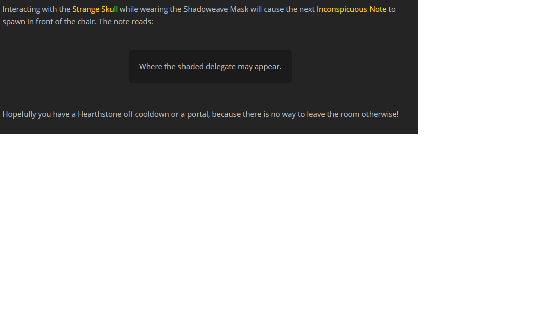 | Additional Information | The dark fissures dialogue should be as followed. <A fissure in the ground, barely wide enough to squeeze through. It's too dark to see anything, but you can tell that it is very deep.> with an option that says: <Drop into the fissure.> which proceeds to a warning "WARNING: You are about to fall into a dark fissure. You may not be able to climb back out again. Are you very sure you want to do this? https://wow.gamepedia.com/Dark_Fissure Here is a full list as well of the whole puzzle but I'll drop the screenshots of what it should be as well. https://www.wowhead.com/guides/lucid-nightmare-secret-mount Thanks for taking the time for this and have a great day, stay safe as well. | ||||