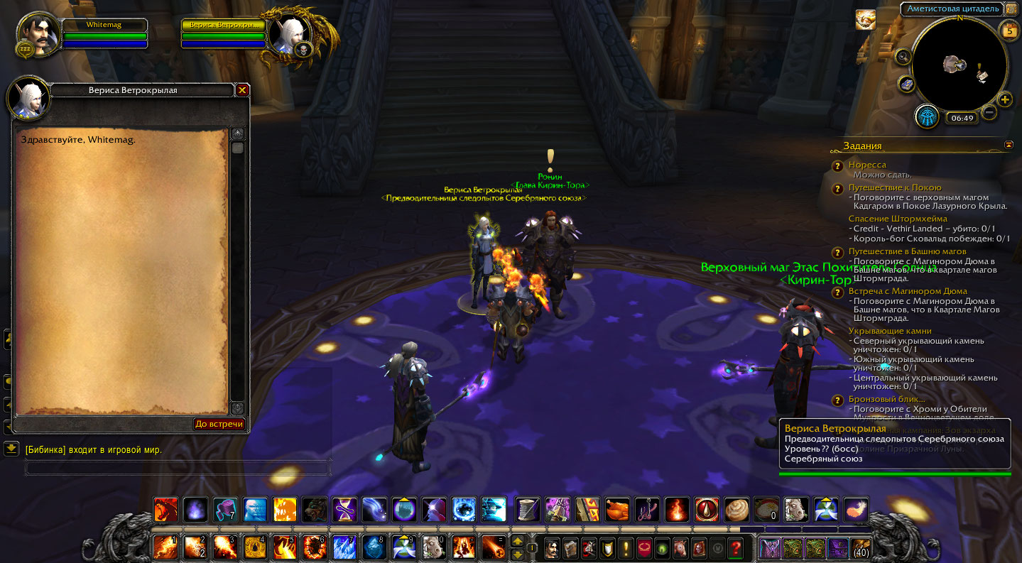 В Экзодаре Велен ничего не дает, квест не продолжается. У Верисы нет списка задач, дать возможность заново пройти цепочку не может, сделайте что нибудь пожалуйста. Да и -Путешествие к покою -Кадгар так и не появился, что с этим делать? WoWScrnShot_040520_105036.jpg (289,151 bytes) |
