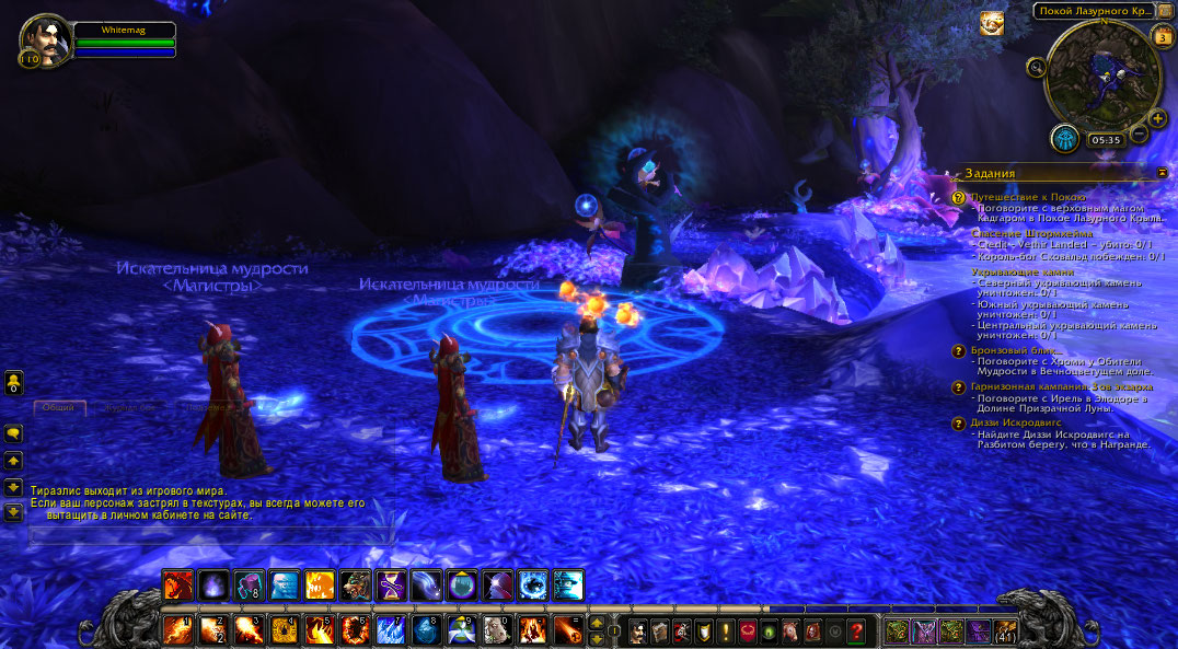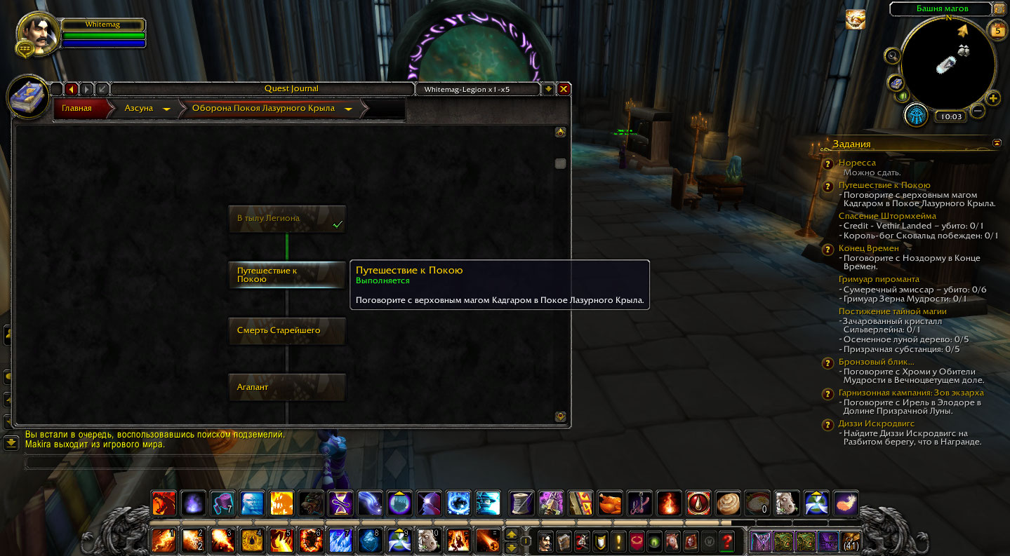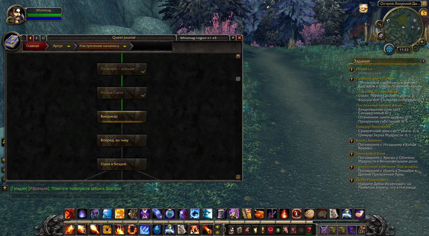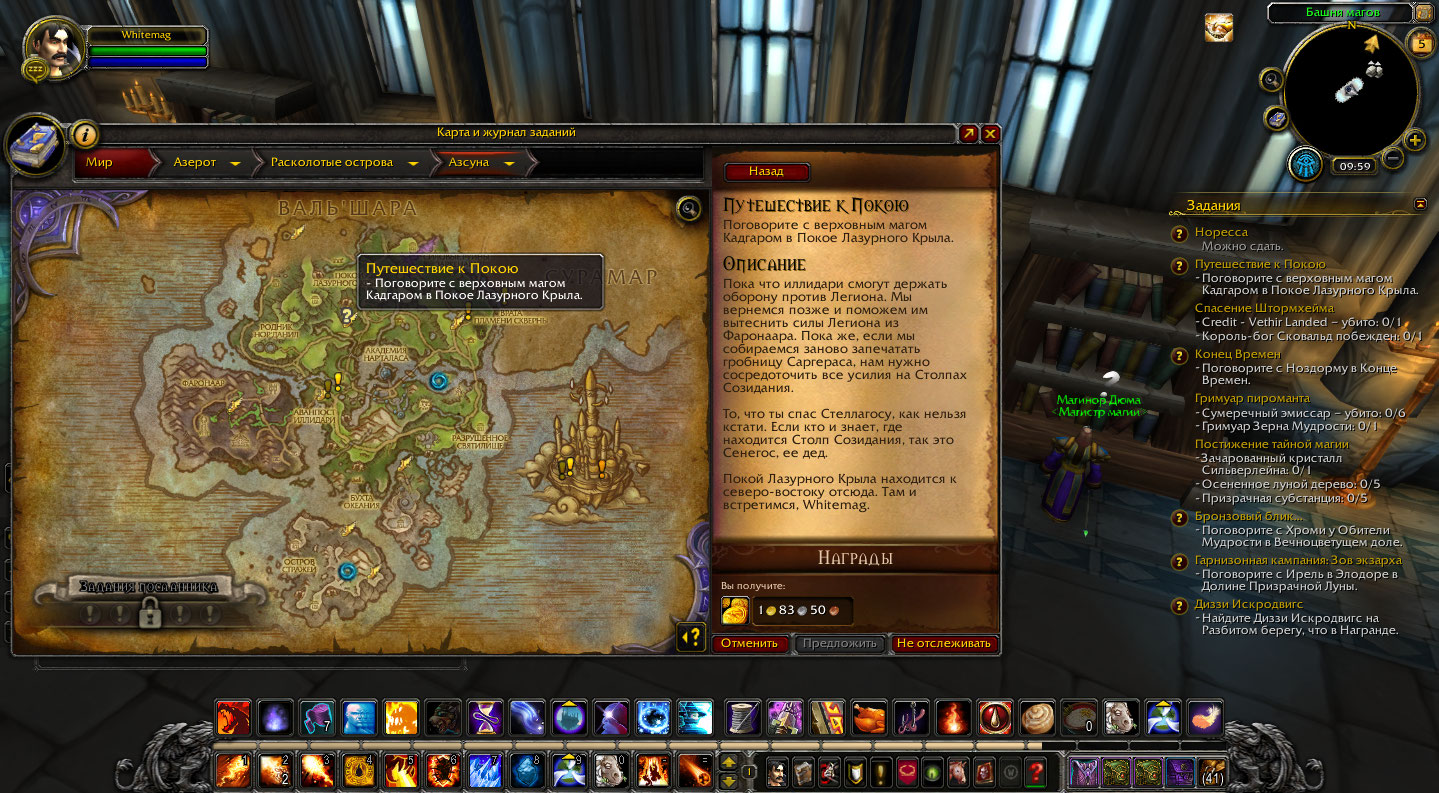 Аддоны поставил. По Аргусу - мне не выпадает автоматически квест рука судьбы. Пробовал взять квест в Огримар у Леди Леадрин (по квесту "двое у моря") - она говорит что еще не договорилась с союзом. По Азсуне -Путешествие к покою -Кадгар так и не появился. Сделайте пожалуйста активным квест после Расколотого берега (можно с Рука Судьбы) и я продолжу или другой. |