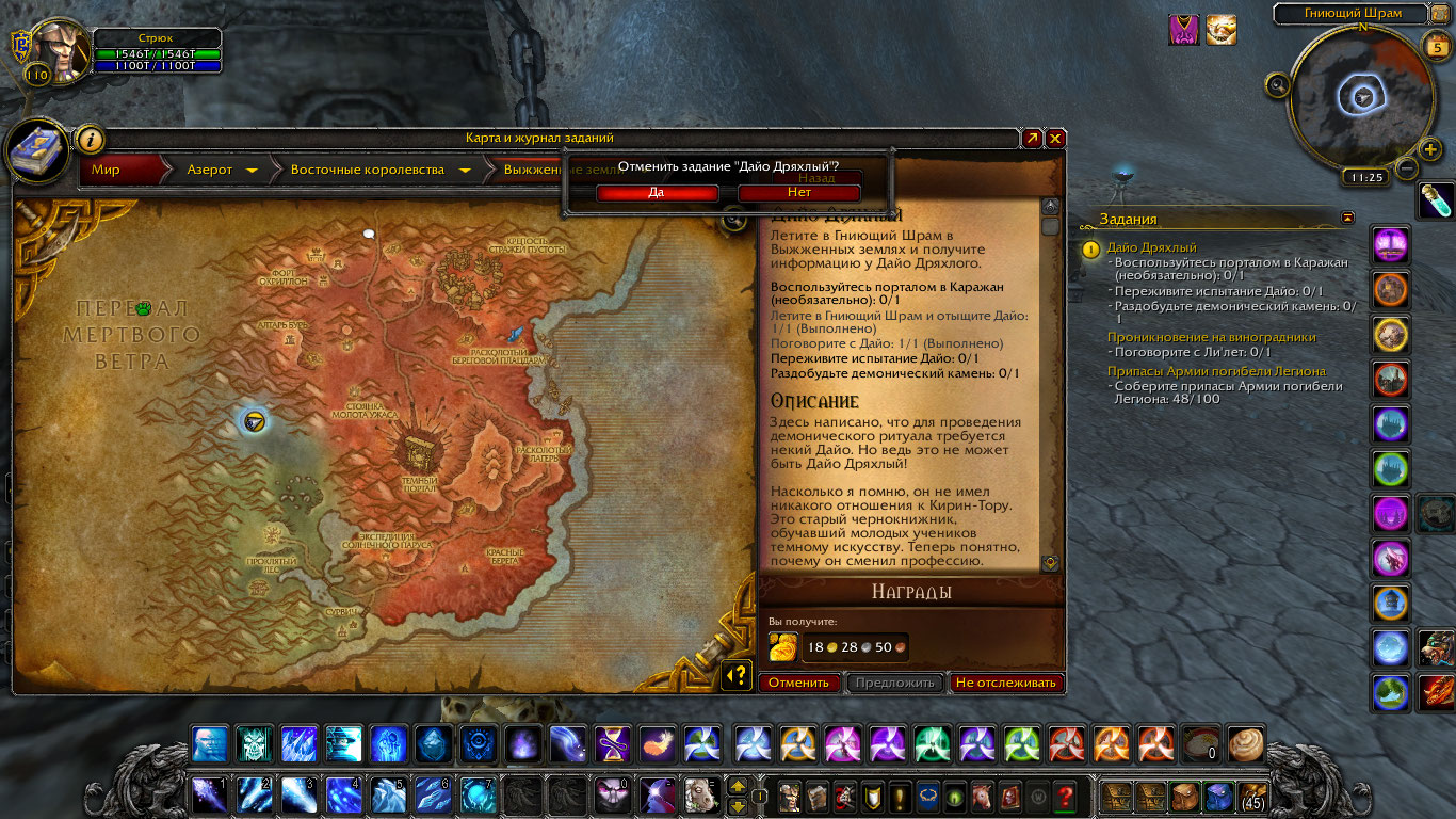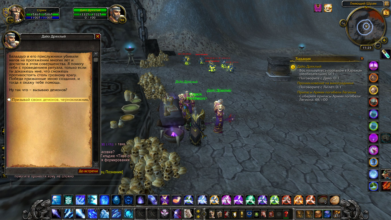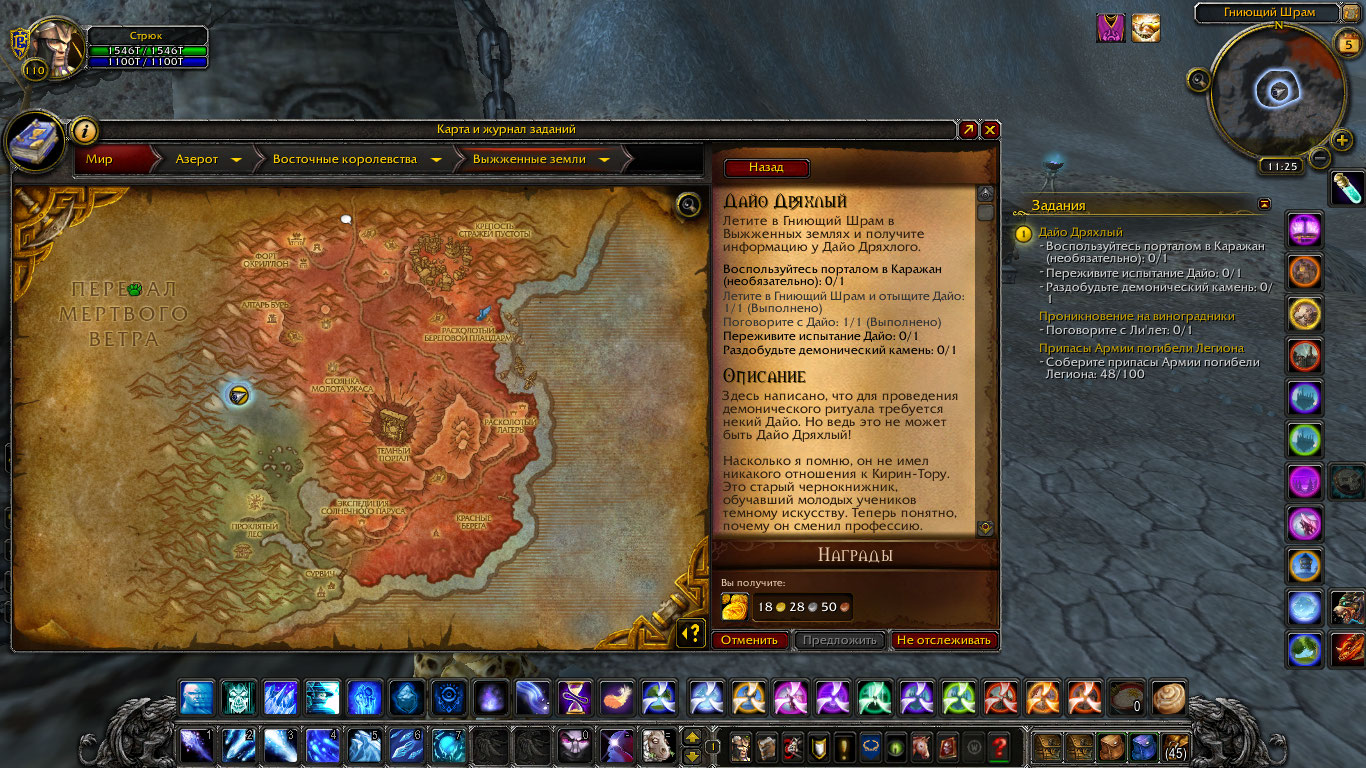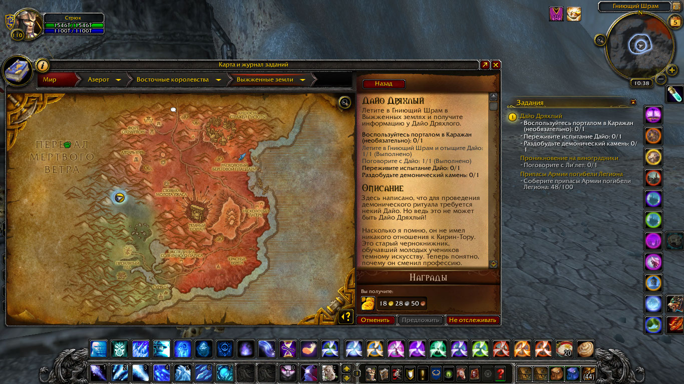 | Steps To Reproduce | Берём квест в оплоте - телепортируемся в Даларан - телепортируемся в Каражан - летим в Гниющий Шрам - говорим с Дайо - натыкаемся на баг. | ||||