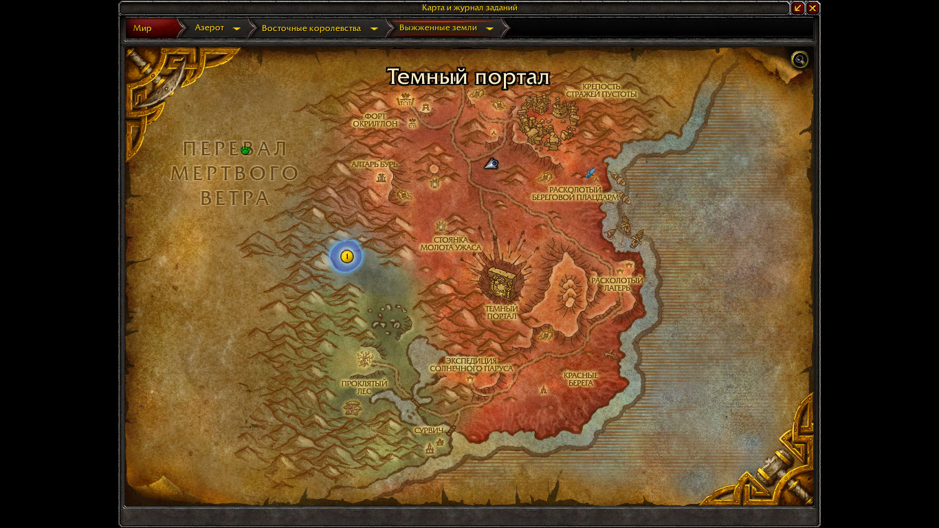 Очистил кэш исправил персонажа, взял квест, добирался до Дайо после взятия кв телепортом до штормграда там из башни магов порталом в выжженые земли дальше долетел до Дайо после разговора всё повторилось исчезает Дайо анимация призыва бесов но самих бесов нет. После отмены кв всё появляется. На скрине видно порталом в каражан не пользовался WoWScrnShot_040520_103754.jpg (301,305 bytes) WoWScrnShot_040520_103826.jpg (372,794 bytes) WoWScrnShot_040520_103844.jpg (311,817 bytes) |