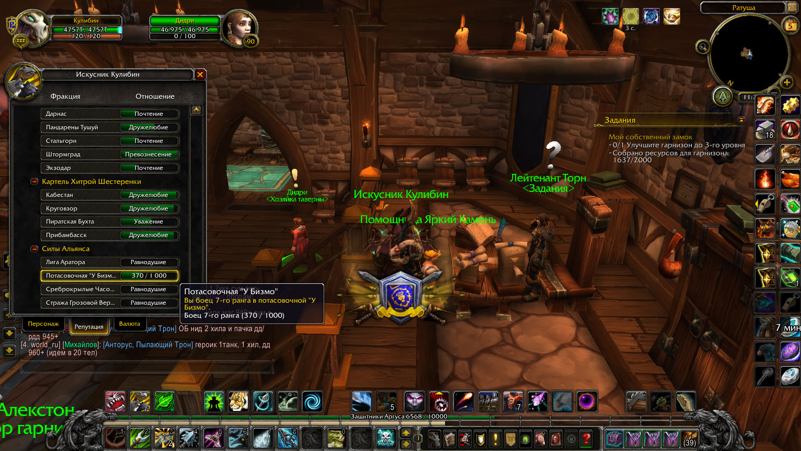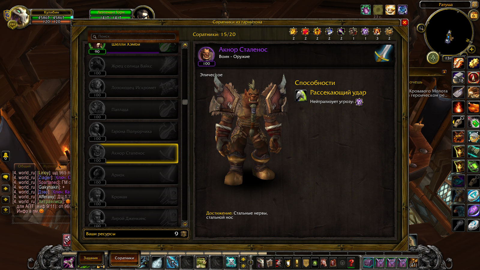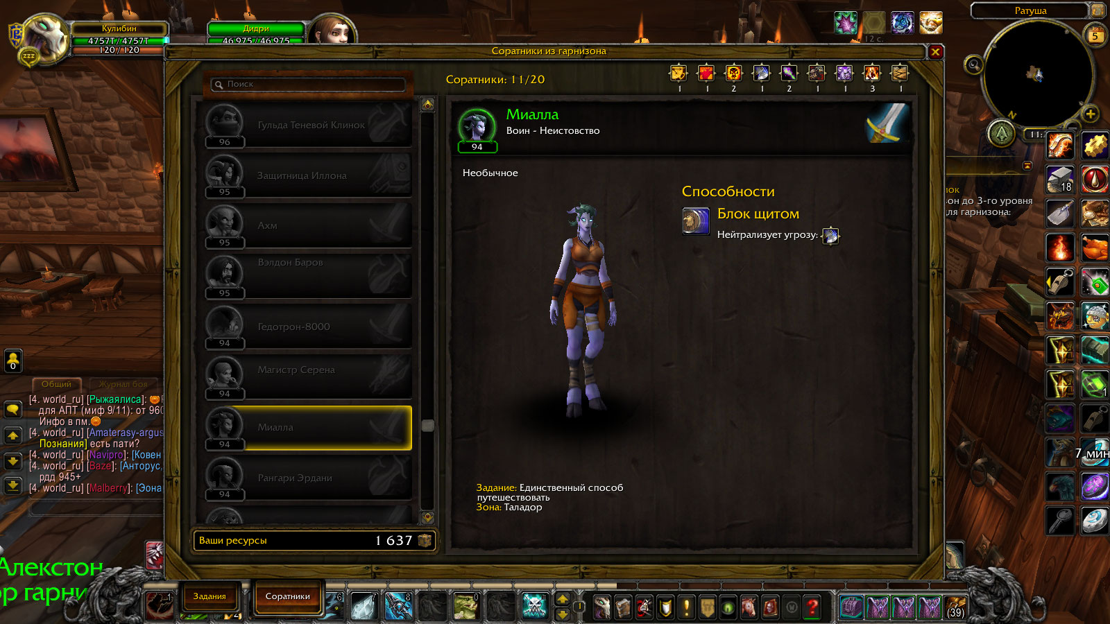| Description | Критерием для получения в гарнизон соратника Мясыш есть получение персонажем 5 ранга на арене в столице после чего он появиться и у Мясыша можно будет брать квест выполнив который и сдав получиш возможность его нанять в качестве соратника в гарнизон .наколупав 7 ранг и прождав уже 3 день эта СКАТИНА так и не пришла в Потасовочную у Бизмо(согласно ВОВХЭДУ)так что квест я не получил.А второе критерий получения соратника Миаллы выполнение квеста-Единственный способ путешествовать.Поскольку это квест в цепочке Достижения -Скатертью Таладарога то пропустить его невозможно по определению.Достижение делалось только для получения этого соратника на что сдавая ей квест(34981) то над нею загорелся значек получения следующего-тоесть нанять ее в гарнизон.После чего ОНА благополучно просто ПРОПАЛА на месте.И Миаллы нет Нив одной из точек ее возможного респа. | ||||