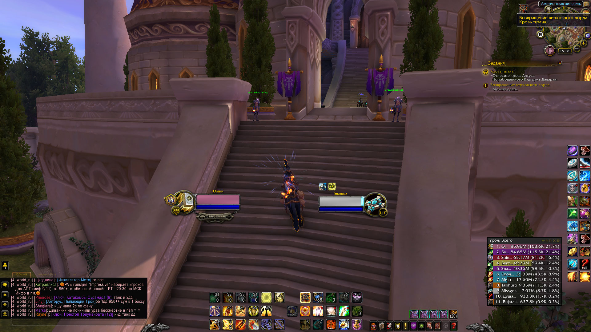 Здравствуйте! Моба у башни нет, потому что башня разрушена. Ждите, пока отстроят заново А по поводу крови титана, напишите в чат следующие команды: .q s 44782 .q s 44821 |
