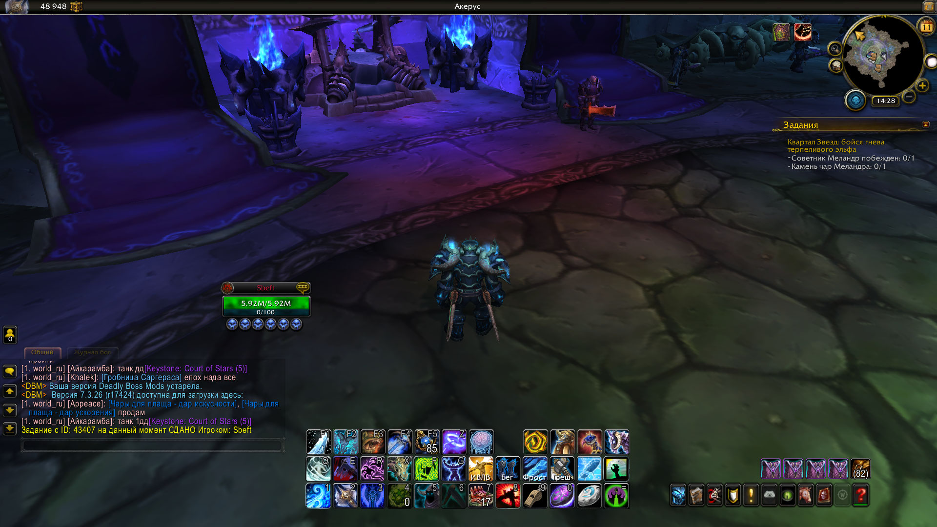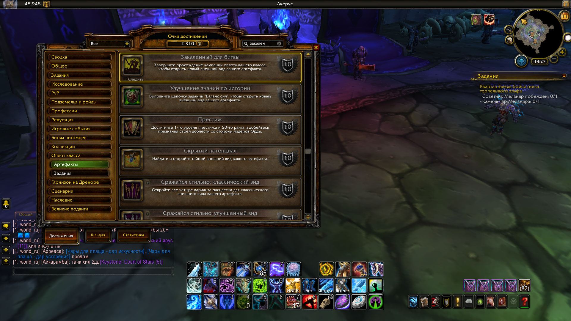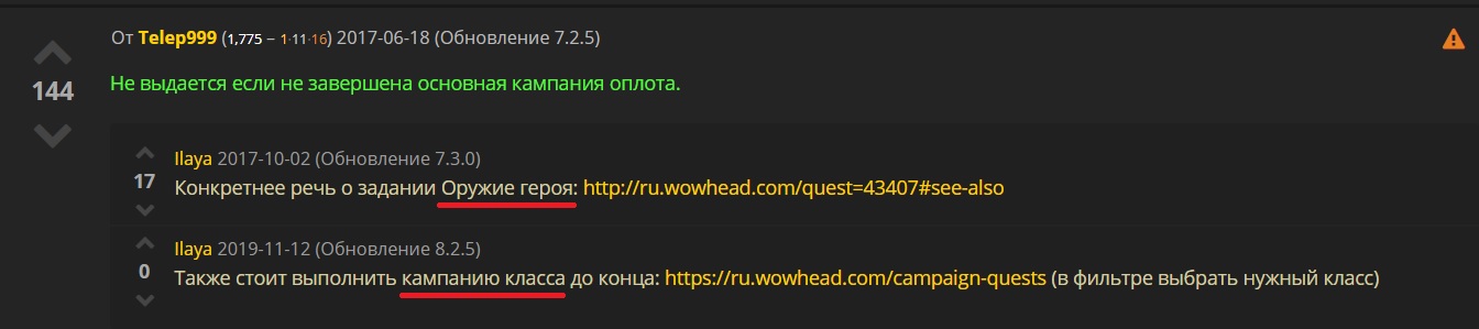 Суть репорта заключается в том, что хотелось бы выполнить цепочку на расколотом берегу, а также на дополнительного соратника в частности. Достижение, также хотелось бы получить, для открытия нового вида артефакта. Как видно из скринов с аддоном, для этого необходим квест "Защитники Армии погибели Легиона" (https://ru.wowhead.com/quest=47137). Данный квест становится доступным после выполнения квеста "Четвертый Всадник" (https://ru.wowhead.com/quest=43686) и "Оружие героя" (https://ru.wowhead.com/quest=43407). Как изначально писал, проблема заключается в квесте "Оружие героя" (https://ru.wowhead.com/quest=43407), так как, насколько я помню, его не выполнял, а он у меня отображается, как пройденный. В связи с этим отсутствует достижение "Закаленный для битвы" (https://ru.wowhead.com/achievement=10746) WoWScrnShot_041420_185154.jpg (457,527 bytes) WoWScrnShot_041420_185209.jpg (500,293 bytes) WoWScrnShot_041420_185228.jpg (547,157 bytes) |