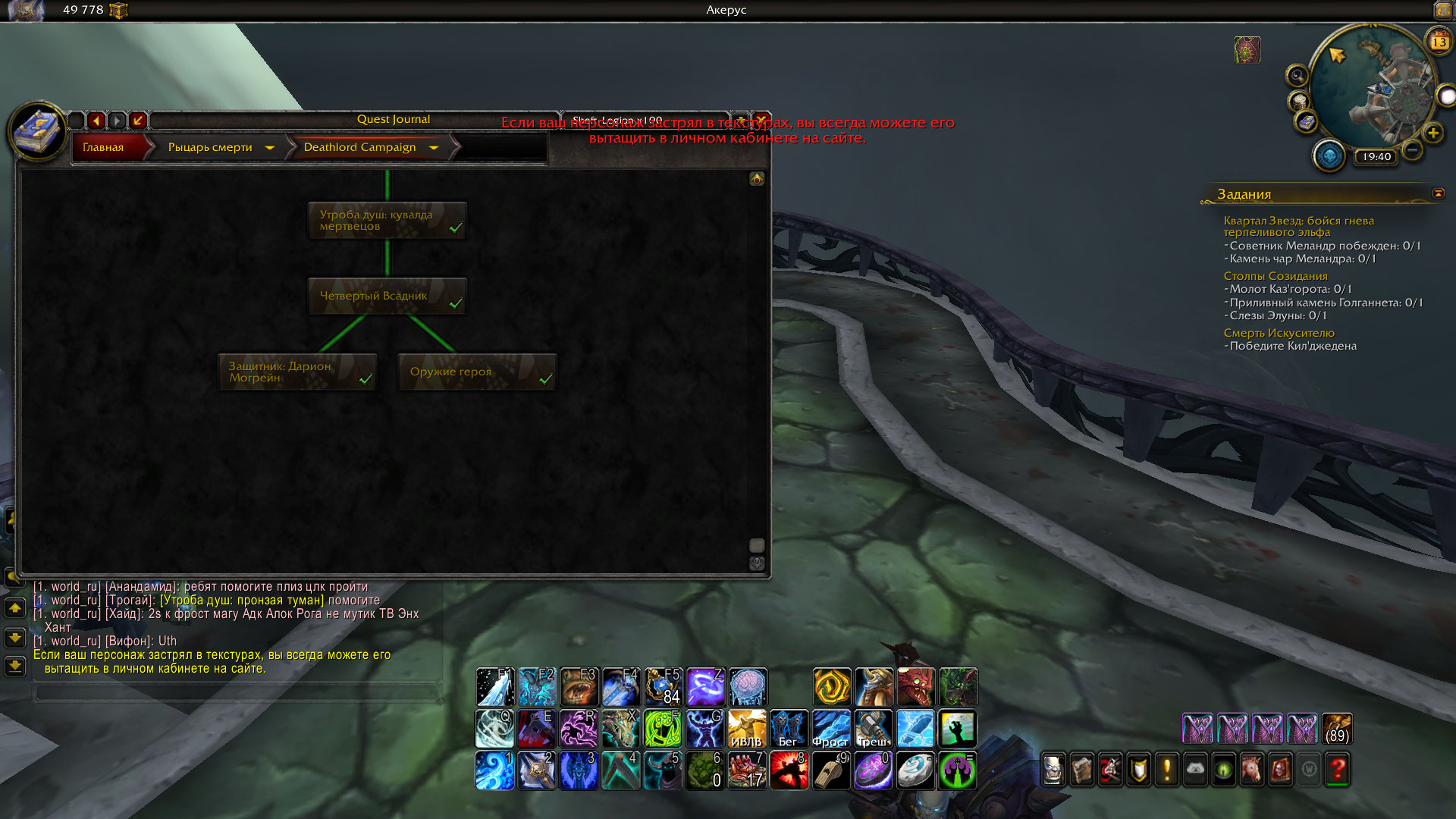 Данный квест я не выполнял, но он отображается у меня выполненным, как уже раньше указывалось. Персонаж не перенесенный. В связи с чем у меня на моем персонаже проблема понять могу, поэтому и пишу сюда. Есть возможность, как-нибудь сбросить данный квест, чтобы пройти его заново? Ну или всю цепочку WoWScrnShot_041520_152214.jpg (597,385 bytes) |