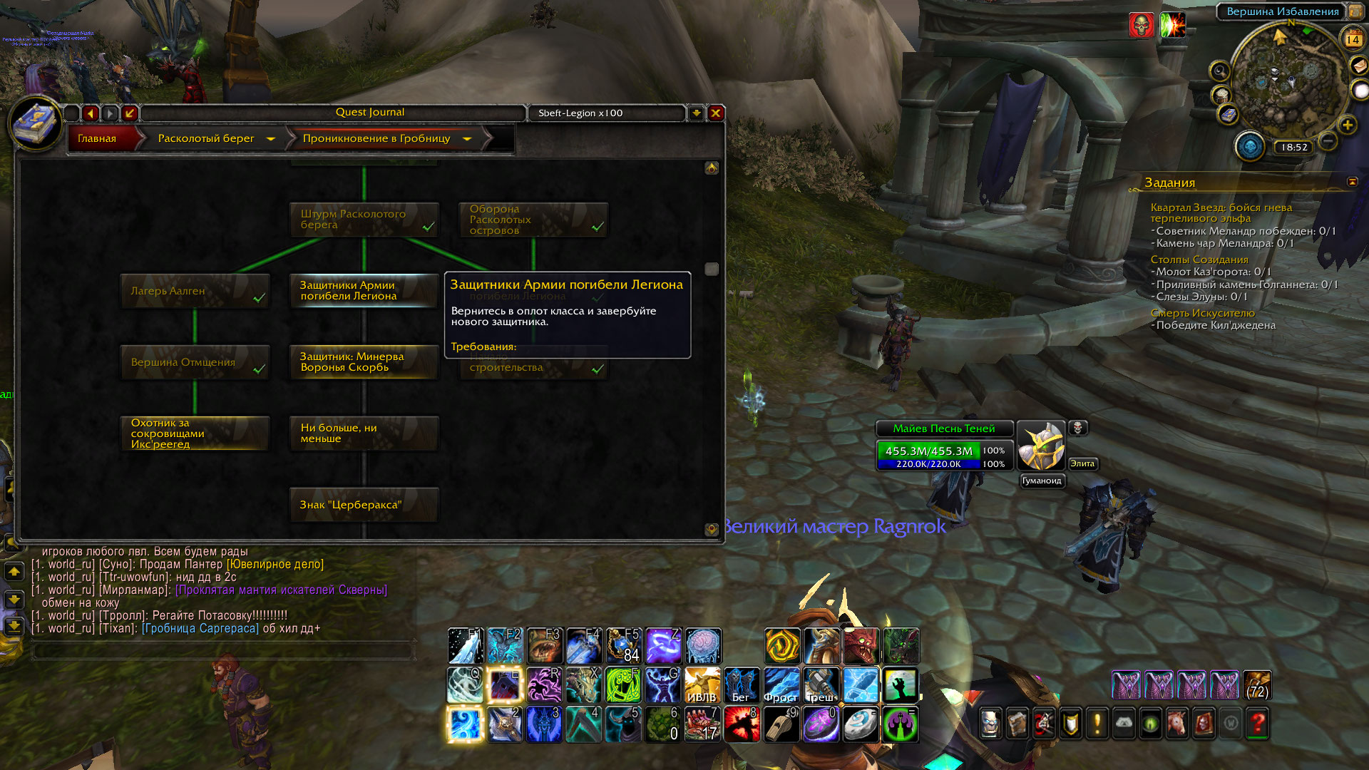 Здравствуйте. Достижение попробуйте получить у дебагера Скиньте скиншот с командой Цепочка оплота .q s 43686 .q s 43574 Что бы быстрей найти в чем у вас проблема попробуйте скачать BtWquests и Btwquests: Legion В этом аддоне легко найти где вы остановились выглядит это вот так Оплот http://egammi.net/image/SX8c Доп защитник на расколотом http://egammi.net/image/SX8h Либо я вам буду кидать команды и вам придется делать это и загружать скриншоты |