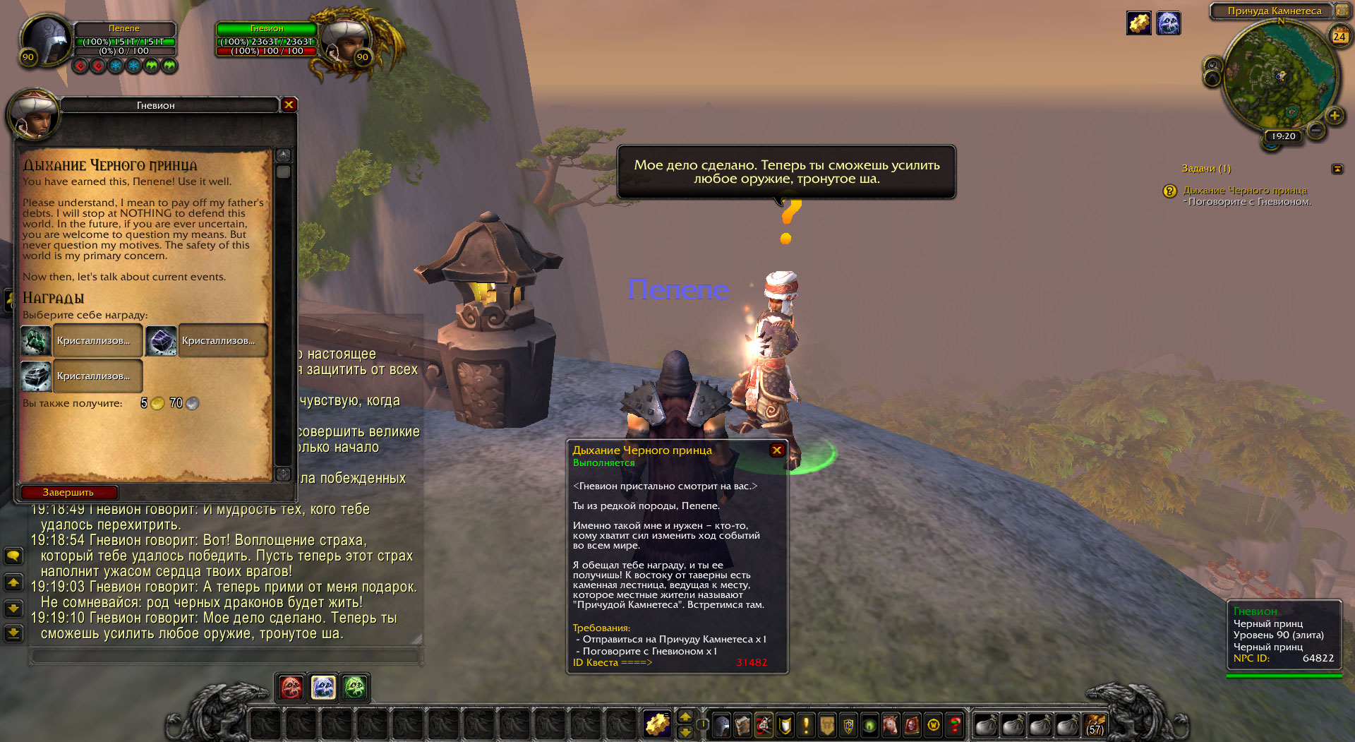 | Description | https://ru.wowhead.com/quest=31482/%D0%B4%D1%8B%D1%85%D0%B0%D0%BD%D0%B8%D0%B5-%D1%87%D0%B5%D1%80%D0%BD%D0%BE%D0%B3%D0%BE-%D0%BF%D1%80%D0%B8%D0%BD%D1%86%D0%B0 При сдаче https://ru.wowhead.com/npc=64822/%D0%B3%D0%BD%D0%B5%D0%B2%D0%B8%D0%BE%D0%BD квест не переведен | ||||